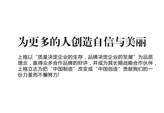 • 上格一路走來,以“締造時尚集團(tuán),使公司受人尊敬,令人向往;為客戶提升價值,創(chuàng)造成功;讓員工提高生活品質(zhì),實(shí)現(xiàn)自我價值”作為我們的目標(biāo),“為更多的創(chuàng)造自信與美麗” 作為我們的使命,立志為把“中國制造” 改變成“中國創(chuàng)造”貢獻(xiàn)我們的一份力量而不懈努力!
